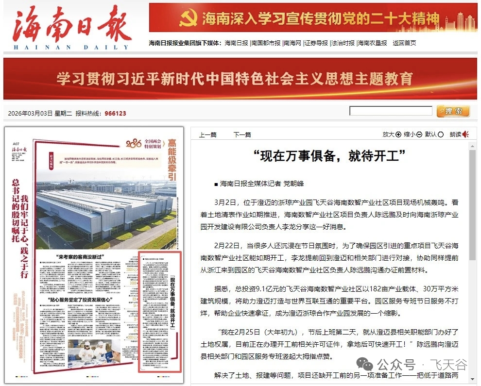 3月2日,海南日报聚焦飞谷控股集团在海南自贸港的重点项目 —— 海南飞天谷数智产业社区,报道项目迎来关键节点:所有开工前准备全部完成,现场机器进场、清表作业有序推进,正式进入开工倒计时!